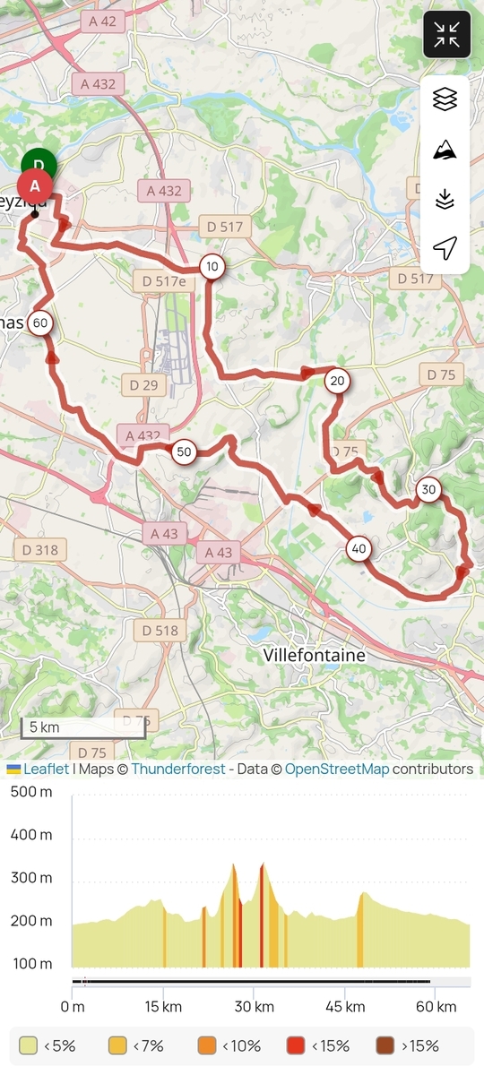Un temps idéal pour le vélo; un parcours bucolique et assez reposant à part 4 montées : celle de Miange, celle de Chamagnieu 320 m d'altitude, celle de Veyssilieu 350 m d'altitude et enfin celle du Roy ; un kilométrage raisonnable 74 km...